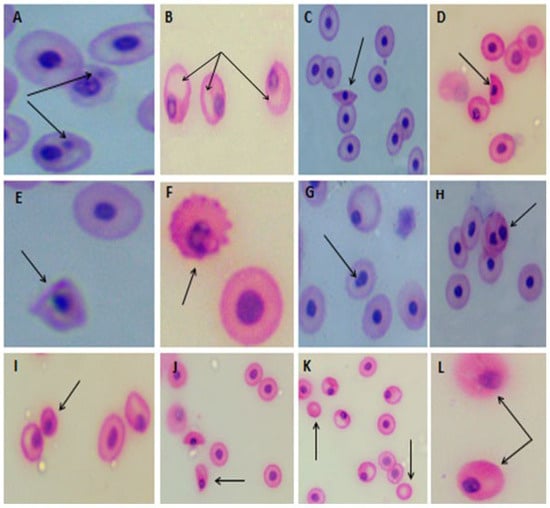 Different erythrocyte alterations were recorded in PS NPs-exposed group. (A) micronucleated cell; (B) vacuolated cell, (C) spindle cell; (D) sickle cell; (E) acanthocyte; (F) crenated cell; (G) notched nucleated cell; (H) bilobed nucleus; (I) microcell; (J) tear-drop like cell; (K) enucleated cell; (L) eccentric nucleus.