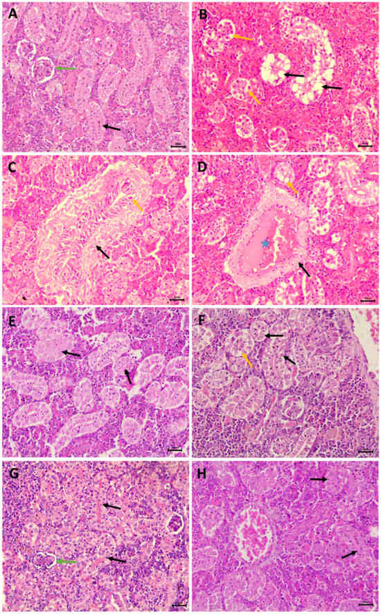 Photomicrographs of kidney transverse sections from control, NPs-exposed and -treated C. gariepinus: Kidney sections of (A) control, (G) selenium- and (H) C. vulgaris-treated catfish show normal histological structures of the kidney that consisted of normally rounded glomeruli (green arrow) and renal tubules that covered by simple columnar epithelium with apical brush border (black arrow). (B–D). Kidney transverse sections of NPs-exposed catfish in (B) shows the presence of vacuolar degeneration in the cytoplasm of tubular epithelium with peripherally located pyknotic nuclei (black arrow) and epithelial necrotic changes with nuclear alterations, dissociation of renal cells and epithelium desquamation (yellow arrow) in (C) shows connective tissue proliferation around the renal tubules (peritubular fibrosis) (black arrow) and necrosis and apoptosis of tubular epithelium (yellow arrow) in (D) shows perivascular connective tissue proliferation (black arrow), thrombosis (star) and vacuolar degeneration (yellow arrow). (E) Kidney transverse section of NPs+Se-treated catfish shows minimal vacuolar degenerative changes and necrotic changes in tubular epithelium; their nuclei appeared round and vesicular and were centrally located (arrow). (F). Kidney transverse section of NPs+Ch-treated catfish shows vacuolar degenerative changes and necrotic changes in tubular epithelium and desquamation (yellow arrow). Some renal tubules appeared normal with minimal cytoplasmic and nuclear alterations (black arrow). H and E staining was performed. Scale bar = 20 μm.