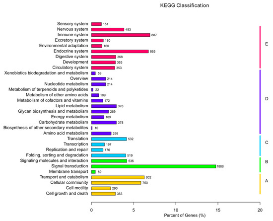 3.4. Enrichment Analysis of GO and KEGG Pathways on the Basis of DEGs