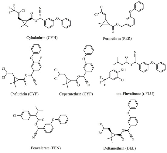 Since the 1980s, PYRs have gained popularity for their high efficiency, low toxicity, and biodegradability in preventing and treating crustacean parasites (such as lernaeidae, sinergasilus, and fish lice) in fishery production in China [11,12,13]. Aquatic organisms would be the most immediate victims if PYRs were to be released into aquatic ecosystems, although they do have satisfactory control effects on pests and external parasites of fish [7]. Due to their lipophilicity, it is difficult to eliminate PYRs once they enter organisms particularly arthropods and fish through food chains [14,15]. Previous studies confirmed that long-term and even low-dose exposure to pyrethroids may result in chronic diseases, since they can act as endocrine disruptors to interfere with the molecular mechanism of vertebrates, especially fish [13,16,17]. PYRs have been found to induce teratogenicity, carcinogenicity, and mutagenicity, and to have toxic effects on the endocrine, immune, and nervous systems of organisms [18,19]. For example, Wang et al. (2020) reported adverse effects on the male reproductive system caused by PYR exposure [20]. Safety concerns arising from pyrethroid residues have attracted widespread attention in recent years, and the determination of pyrethroid residues in aquatic products is vital for ensuring food safety.