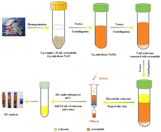 The procedure is depicted in Figure 2 and comprised the following steps. (1) To begin 5.0 g of homogenized sample was placed in a 50 mL polypropylene centrifuge tube and mixed with 10 mL of acetonitrile. (2) Then, 4 g of anhydrous NaCl was added to the mixture, vortexed for 2 min using a Multitube Vortex Mixer (DMT-2500, MIULAB, Hangzhou, China), and centrifuged at 4000 rpm for 5 min using a refrigerated centrifuge (CF16RX, Hitachi, Tokyo, Japan). The resulting supernatant (10 mL) was transferred to a new centrifuge tube, while the remaining residue was extracted again with 5 mL of acetonitrile and the second obtained supernatant (5 mL) was combined with the first one. (3) Following this, 5 g of anhydrous Na2SO4 was added to the obtained solution, and the mixture was vortexed for 1 min and centrifuged at 4000 rpm for 5 min. After centrifugation, 5 mL of n-hexane saturated with acetonitrile was added to the mixture, which was shaken for 2 min to homogenize and then centrifuged at 4000 rpm for 5 min. The upper layer of n-hexane was discarded, and the remaining liquid was cleaned once more with 5 mL n-hexane saturated with acetonitrile. (4) The extracts (15 mL) were transferred to Cleanert® Alumina N columns, which were preconditioned with 5 mL of acetonitrile before use. (5) The effluents were collected in 20 mL glass tubes and evaporated to dryness under a stream of nitrogen at 40 °C. (6) The extracted samples were reconstituted with 2.0 mL of n-hexane by homogenization. Finally, 2 μL of the final solution was used for GC analysis.