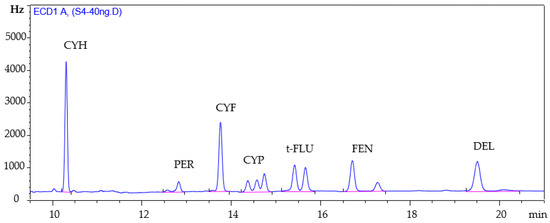 Under the selected chromatographic conditions, the samples were not interfered with by other substances in the retention times of the pesticides analyzed. The selectivity of the analytical method was verified by comparison of the chromatogram of a sample without the addition of the pesticide standard with the same sample fortified with the standards of the compounds analyzed at a concentration of 40 ng/mL for each PYR.