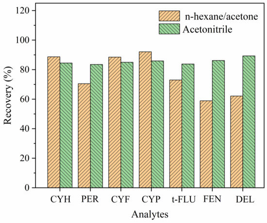 The selection of suitable solvents is very important to obtain good sensitivity and better extraction efficiency of the PYRs [39,40]. Commonly, the extraction solvents are n-hexane, ethyl acetate, acetone, and acetonitrile. N-hexane/acetone (1:1) and acetonitrile were used for the extraction of spiked carp samples with 20 μg/kg of each pyrethroid in this study. The ethyl acetate reagent was excluded because of its impurity peaks and large baseline noise, which could disturb the accuracy and quantification of the target. As can be seen in Figure 4, several PYRs achieved high recoveries when N-hexane/acetone (1:1) was applied, such as CYH (88.7%), CYF (88.5%), and CYP (92.1%), while the recoveries of FEN and DEL were only 58.9% and 62.1%. Satisfactory recoveries (>83%) were obtained when acetonitrile was used to extract the PYRs as presented in Figure 4. Using acetonitrile as extraction agent has less interference on the extraction process, which could not only shorten the extraction process, but also cater to the requirements of the recoveries. Therefore, acetonitrile was selected as the extraction reagent in this study.