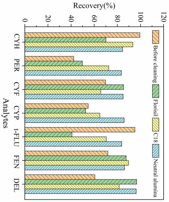In this study, three different commercial SPE cartridges (Florisil, C18 and neutral alumina) were evaluated by analyzing spiked carp samples with 20 μg/kg of PYRs, to obtain better recoveries for each PYR. Figure 5 and Figure S2 showed the effect of three SPE cartridges on the removal of matrix interference and the recoveries of the seven PYRs. As presented in Figure S2, better elimination of the matrix effect was obtained when using the neutral alumina cartridge, since the matrix effects were still obvious after purification with Florisil and the C18 cartridge. Significant differences were observed in the spiked recoveries of the seven PYRs when purified by three different SPE cartridges. The spiked recoveries of PER, CYP, and DEL were relatively low without SPE cartridge purification, indicating that the three pesticides had matrix effects, which needed to be further weakened. As shown in Figure 5, three analytes (CYF, FEN, and DEL) obtained high recoveries (more than 85%) using Florisil cartridges, but the recoveries of PER, CYP, and t-FLU were less than 53%. Acceptable recoveries were achieved using the C18 cartridge, since CYH and FEN (93.4% and 89.7%) were higher than when using the neutral alumina cartridge (84.5% and 86.2%). However, the recoveries of other PYRs were all lower than that using the neutral alumina cartridge, especially CYF (65.7%) and CYP (64.9%). Due to the polarity of their chemical structure, PYRs are difficult to retain on the neutral alumina cartridge, which is commonly used to remove aromatic and aliphatic compounds [43,44]. The results verified that all seven PYRs could flow out completely with recoveries above 83% when a neutral alumina cartridge was used. The observed results showed that neutral alumina cartridges are relatively more stable, and better than the other two SPE cartridges when considering the purification effects. Therefore, the neutral alumina cartridge was finally used as the pass-through cleanup cartridge for pyrethroid purification in this study.