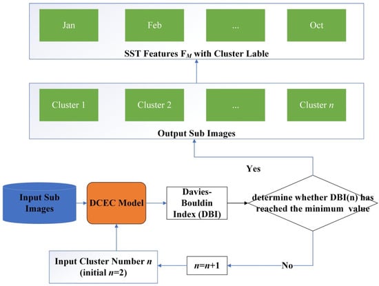 - The 46,524 SST sub-images are put into the DCEC model, and the initial cluster number n is set as 2;