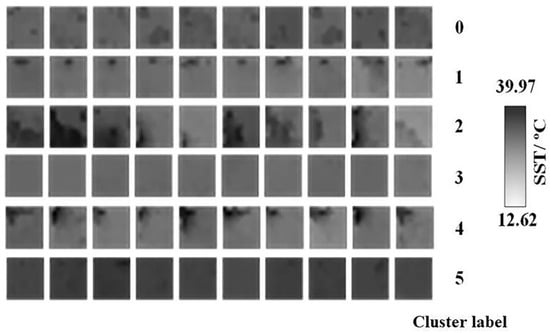 - For each CPUE grid, the SST feature for the Mth month is determined by identifying the assigned cluster labels of the images that appear with the highest frequency within a month. This is expressed as follows:where represents SST feature for the Mth month. The term “Mode” is a statistical term that refers to the value that occurs most frequently among the images in the Mth month; are the labels of images in that specific month. The above feature extraction process is performed based on Python 3.7.