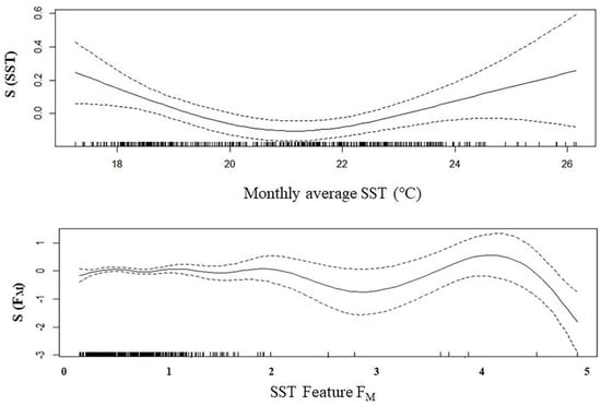 - Improved GAM, which integrates the extracted SST features along with the average Chl a value. This approach aims to enhance the predictive capability of the model by incorporating more comprehensive and refining representations of the SST monthly feature. The improve GAM model expression is shown in Formula (7):where represents the monthly catch per unit effort; represents the monthly average of the concentration of chlorophyll a; represents the monthly SST extracted feature value; represents the natural cubic spline smoothing function. The error distribution of the model is assumed to be Gaussian distribution.
