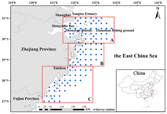 Map of the bottom trawl survey area in Zhejiang Province and adjacent waters of China. A: Northern Zhejiang, B: central Zhejiang and C: southern Zhejiang. The blue dots represent the survey stations.
