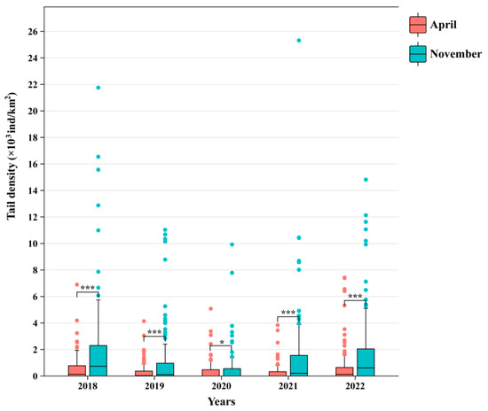 All of the samples were grouped according to the sampling time, and all of the stations were divided into April and November. Using R 4.0.3 software, based on the generalized linear model, the Poisson regression method was selected to evaluate the significant differences in the tail density of C. lucidus in different months.