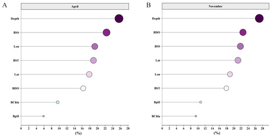 The relative importance of explanatory variables for determining the distribution of C. lucidus. (A) Importance ranking of explanatory variables in April. (B) Importance ranking of explanatory variables in November. The X-axis represents the importance score of each explanatory variable, and the Y-axis represents different explanatory variables. The larger the shape of the point, the deeper the color, and the more important the variable.
