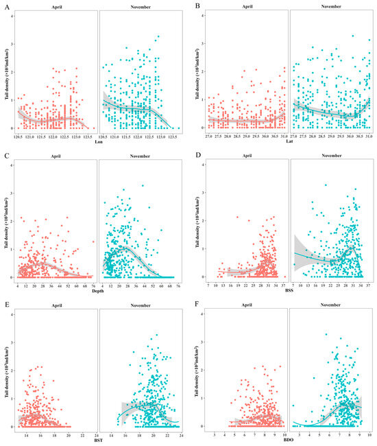 The relationships between the distributions of C. lucidus species in spring and autumn and important environmental variables according to the RF model. (A) Lon; (B) lat; (C) depth; (D) BSS; (E) BST; (F) BDO. The X-axis is the range of each variable, and the Y-axis is the corresponding tail density. The curve represents the nonlinear fitting curve, and the shadow represents the confidence interval.