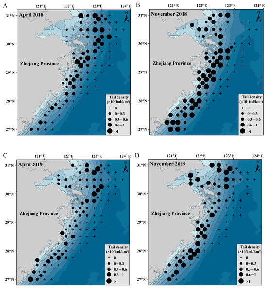 In terms of time, the distribution of C. lucidus in offshore Zhejiang changed significantly between different months and different years. The tail density of C. lucidus in April was significantly lower than that in November (Figure 2 and Figure 5). The distribution change was related to spawning, feeding and migration [29]. There are two spawning periods for C. lucidus in offshore areas of the Zhejiang Province. The spawning period in spring and summer is from late April to July. The spawning period in autumn is from September to October [30]. In spring, with increasing water temperature, the population of C. lucidus began to migrate from the deep-water area to the offshore area for feeding to prepare for life activities such as spawning and reproduction. It is speculated that the survey object of this study, which was conducted in April, was mainly spawning parents. The tail density increased significantly in November. At this time, many spawning parents had completed their breeding activities. After breeding in that year, the larvae could be captured by bottom trawling in November, which increased the tail density. It is speculated that the survey objects in November included spawning parents and supplementary groups. This also explained why the relative weight of the individuals in November was lower than that in April (Table 1). In terms of interannual variation, the tail density of C. lucidus first decreased and then decreased from 2018 to 2022. It was relatively low in 2019 and 2020 (Figure 2). The optimum bottom temperature of C. lucidus in the study area was between 17 and 21 °C in autumn, and the density was negatively correlated with the water temperature (Figure 4). According to relevant reports from the China Meteorological Administration, due to global warming, 2019 was the warmest year in which the ocean temperature was recorded [31]. The synchronous environmental data of this survey showed that the average bottom temperature in the autumn of 2019 and 2020 reached 21 °C. It is speculated that higher temperatures may affect the reproductive development of C. lucidus. In addition, the sudden outbreak of coronavirus (COVID-19) in 2019 has had a significant impact on global marine fishing [32]. During the coronavirus infection period, due to transportation restrictions and declining consumer demand, the amount of C. lucidus fishing was reduced. It is known that fishing is a key factor influencing fish resources, particularly in the short term [33], which may be the reason for the low density of C. lucidus in 2019–2020. However, the decline in industrial and daily activities during the coronavirus has also played a positive role in the recovery of marine species to a certain extent [34]. In addition to the gradual recovery of fishing activities after coronavirus, the resources have gradually increased since 2021.