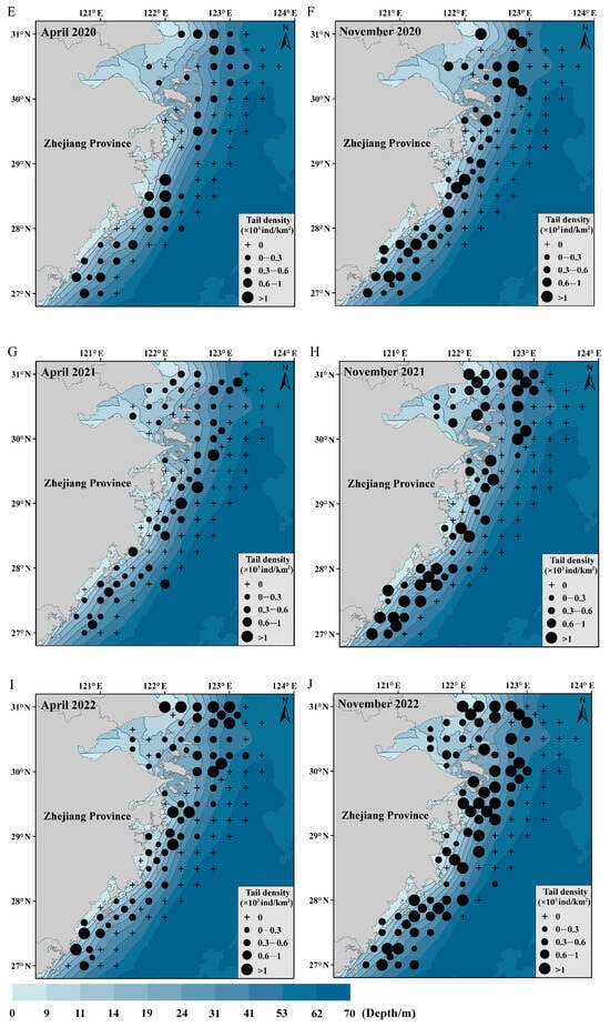 The distribution of C. lucidus in spring and autumn in Zhejiang coastal waters from 2018 to 2022. (A) April 2018; (B) November 2018; (C) April 2019; (D) November 2019; (E) April 2020; (F) November 2020; (G) April 2021; (H) November 2021; (I) April 2022; (J) November 2022.