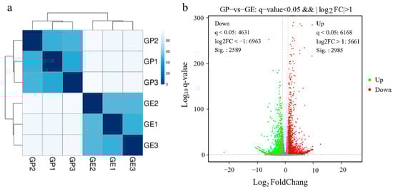 (a) Sample-to-sample distances in each group. The GP group includes samples GP1, GP2, and GP3; the GE group includes samples GE1, GE2, and GE3. (b) Volcano plots depicting differentially expressed genes (DEGs) in the GP vs. GE.