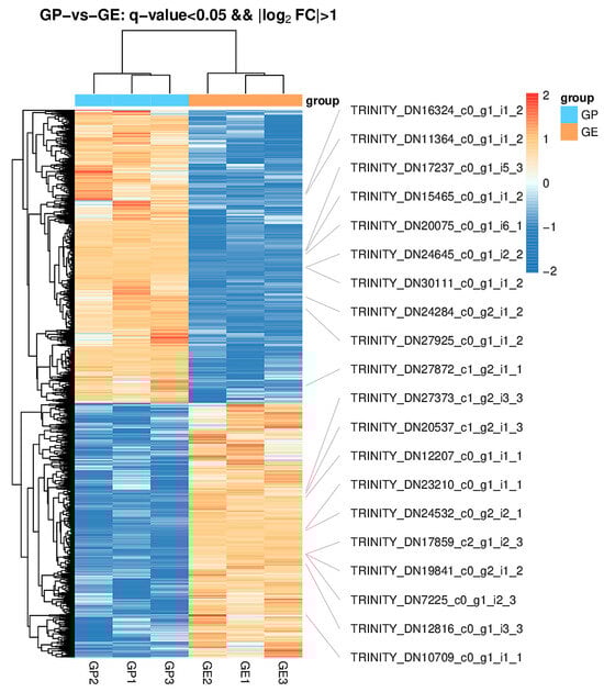 The hierarchical cluster analysis of DEGs was conducted using Trinity [] to illustrate the expression patterns of unigenes across various groups and samples. The results indicated a significant difference in gene expression patterns between the GP and GE groups (p < 0.05; Figure 2).