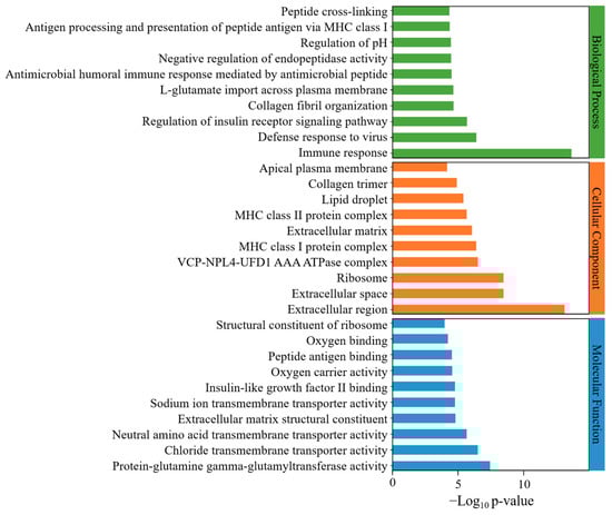 The top 30 entries from the Gene Ontology (GO) enrichment analysis, with the top 10 entries in each category ordered by the −log10 p-value of GO entries and the number of different genes (number > 2) in the three categories, are presented in Figure 3. The findings revealed that the primary DEGs were enriched in the immune response, extracellular matrix (ECM), ribosome, protein-glutamine gamma-glutamyltransferase of biological processes, cellular components, and molecular functions, respectively. Notably, the term “insulin-like growth factor II binding” in the GP vs. GE comparison may be a key factor in explaining the growth differences between the GP and GE groups.