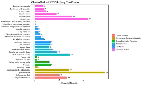 The KEGG pathway classification (Figure 4) showed all DEGs categorized into six groups based on their biological functions: human diseases (1266), organismal systems (866), environmental information processing (543), cellular processes (445), metabolism (316), and genetic information processing (175; Figure 4). Pathways related to the metabolism of GP vs. GE were further subdivided into eight subsets, primarily including amino acid metabolism (60), lipid metabolism (79), carbohydrate metabolism (45), the metabolism of co-factors and vitamins (32), glycan biosynthesis and metabolism (28), and energy metabolism (19; Figure 4). Additionally, subsets such as the immune system (269), endocrine system (189), infectious diseases of a bacterial origin (180), cell growth and death (125), and transport and catabolism (164) were the main components of organismal systems, human diseases, and cellular processes, respectively.