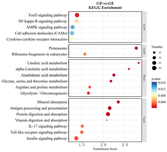 Enrichment analysis of differentially expressed genes in Kyoto Encyclopedia of Genes and Genomes pathways (top 20) in G. przewalskii (GP) vs. G. eckloni (GE). The horizontal axis in the figure is the enrichment score; larger bubble denotes a more substantial number of genes in the enriched pathway, the bubble color changes from blue–yellow–red, and the smaller the enrichment p-value, the greater the significance.
