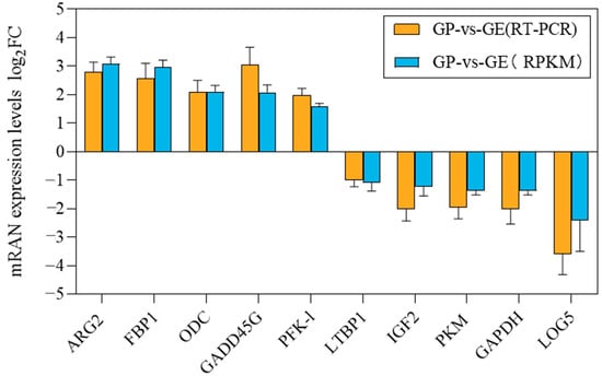 Randomly selected DEGs in GP vs. GE (ARG2, FBP1, ODC, GADD45G, PFK-1, LTBP1, IGF2, PKM, GAPDH, and LOG5) underwent validation through a quantitative real-time polymerase chain reaction (qRT–PCR). Primer design was based on the mapped sequences (Table 1). Results from qRT–PCR were compared with those obtained from transcriptome sequencing, and demonstrated consistency between the two different methods (Figure 6).