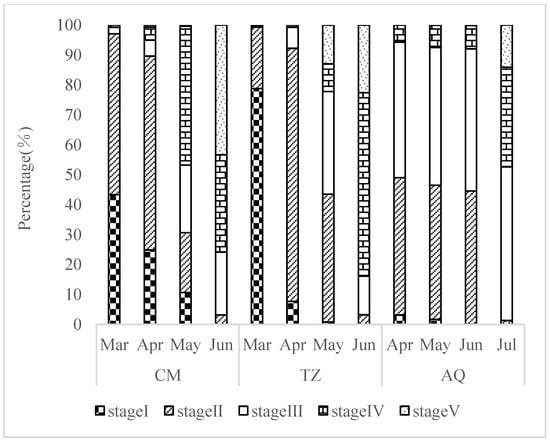The GSIs of stages I–V were 0.79%, 1.24%, 1.80%, 5.58%, and 8.22%, respectively, from March to July. In March, the CM and TZ sections were dominated by stages I and II, accounting for 97.06% and 99.34% of the total, respectively. In April, they were still dominated by stages I and II, accounting for 89.61% and 92.21% of the total, respectively, while the AQ section was dominated by stages II and III, accounting for 49.01% and 45.26% of the total. In May, the CM section was dominated by stage IV, accounting for 46.37% of the total, and stages II and III were dominant in the TZ and AQ sections, accounting for 77.04% and 90.82% of the total, respectively. In June, the CM and TZ sections were mainly dominated by stages IV and V, accounting for 75.79% and 83.87% of the total, respectively. Meanwhile, stages II and III in the AQ section accounted for 91.94% of the total. In July, stages III and IV in the AQ section accounted for 51.31% and 47.38% of the total, respectively (Figure 2). The average water temperature from March to July showed an increasing trend, being 15.47 °C, 17.08 °C, 21.87 °C, 24.63 °C, and 27.69 °C, respectively.