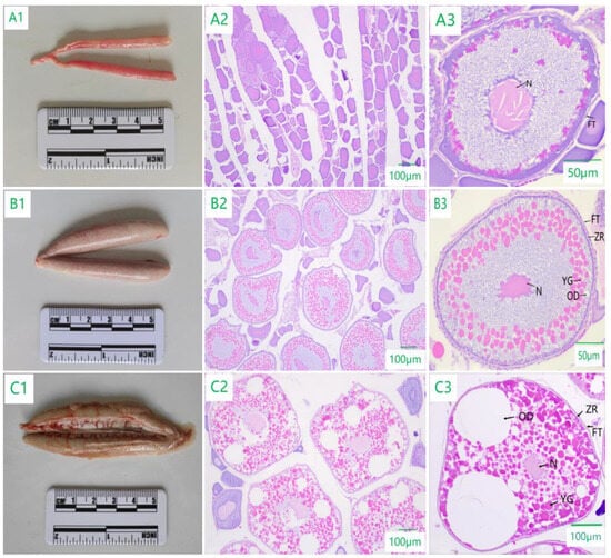 Morphological and histological characteristics of ovarian development of C. nasus. (A1,B1,C1) are the morphology of ovaries in stages II, III, and IV. (A2,B2,C2) are the tissue section observation results of ovaries in stages II, III, and IV. (A3,B3,C3) are oocytes in phases 2, 3, and 4. N: Nucleus; FT: Follicular membrane; YG: Yolk granule; OD: Oil droplet; ZR: Zona radiata.
