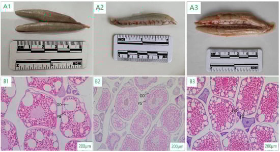 The ovaries in stage II were finely columnar, with inconspicuous blood vessels in the ovarian membrane and a slightly transparent light flesh red to flesh yellow appearance, with no oocytes visible to the naked eye. Histological observation showed that the oocytes were closely arranged, and in the small growth phase of the primary oocytes, dominated by the cells of the second temporal phase, the oocytes of the second temporal phase were round, oval, or irregularly polygonal; the cells had a long diameter of 78.90–170.20 μm and a short diameter of 40.50–120.30 μm; the cell nucleus had a diameter of 30.00–70.10 μm; the cytoplasm was strongly alkaline and stained dark purple; the chromatin in the nucleus was finely linear; and the cytosol was surrounded by a single layer of a follicular membrane (Figure 3(A1–A3)).