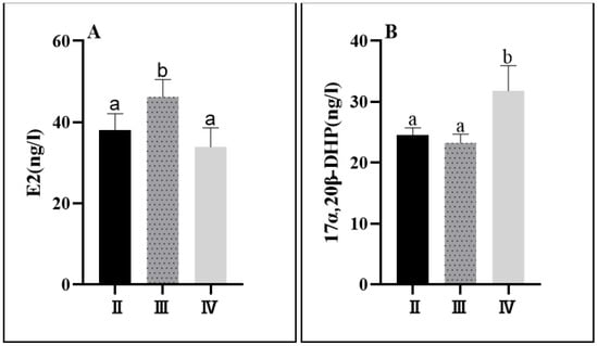 Serum sex steroid levels at different developmental stages of C. nasus. E2 level (A); 17α,20β-DHP level (B). Significant differences are presented with different superscript letters (p < 0.05).