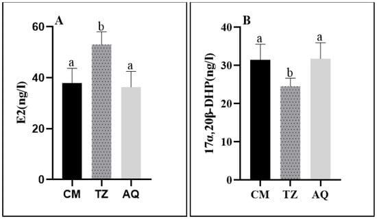 Both estrogen and progesterone showed significant differences during the anadromous migration of C. nasus. The E2 level was significantly higher in the TZ section than in the CM section and the AQ section during stage IV, and the 17α,20β-DHP level was significantly lower in the TZ section than in the CM section and the AQ section. (Figure 6).