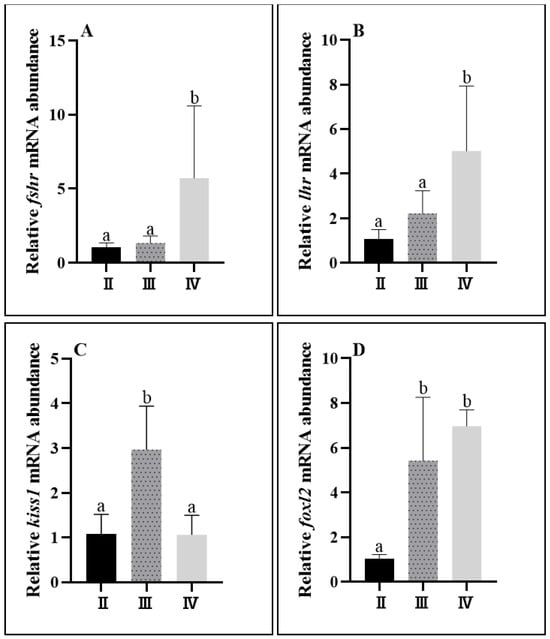 Ovarian gene expression levels at different developmental stages of C. nasus. Fshr mRNA level (A); lhr mRNA level (B); kiss1 mRNA level (C); foxl2 mRNA level (D). Significant differences are presented with different superscript letters (p < 0.05).