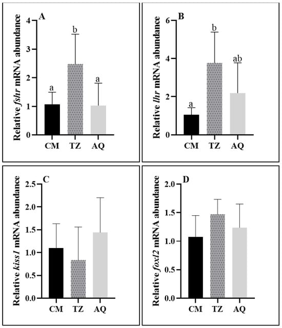 The expression of fshr was significantly higher in the TZ section than in the CM and AQ sections, and the expression of lhr was significantly higher in the TZ section than in the CM section. There was no significant difference in the expression of kiss1 and foxl2 (Figure 8).