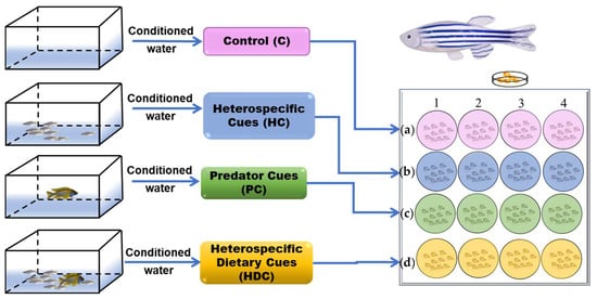 Schematic diagram of the experimental design. Embryos were exposed to control (a), heterospecific cues (b), predator cues (c), and heterospecific dietary cues (d) from day 1 until day 6. Embryonic development was observed at 24 h intervals. The behavior of embryos subjected to four different rearing conditions was evaluated at 5 and 6 dpf.