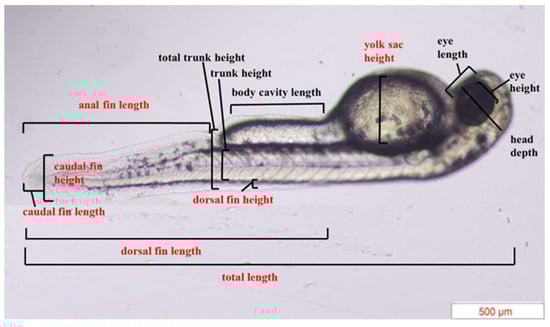 The two or three embryos that hatched randomly in each well were recorded, resulting in a total of ten embryos from four wells []. The morphological measurements of newly hatched zebrafish larvae were recorded using an Olympus CKX53 inverted microscope. In accordance with a previous report [], a total of 13 matrices were measured, including total length, head depth, eye length, eye height, yolk sac height, body cavity length, total trunk height, trunk height, dorsal fin length, dorsal fin height, caudal fin length, caudal fin height, and anal fin length (Figure 2).