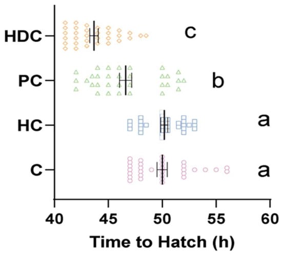 The fish in the control group hatched within a time frame of 45 to 60 hpf (Figure 3). The hatching times in the PC group (mean 46.6 hpf) and HDC group (mean 43.7 hpf) were both accelerated compared to those of the control group (mean 50.0 hpf) by 6.8% (Kruskal–Wallis p < 0.001) and 12.6% (Kruskal–Wallis p < 0.001), respectively. There was a significant difference between the PC group and the HDC group (Kruskal–Wallis p = 0.013). However, no significant differences were observed in the HC group compared to the control (Kruskal–Wallis p = 1) (Figure 3).