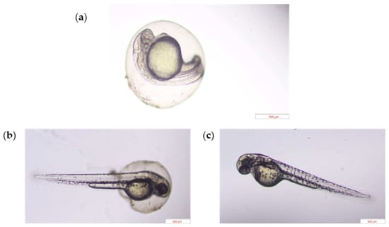 Representative developmental images at 45.0 hpf are shown in Figure 4a–c, suggesting that the embryo treated with HDC and PC exhibited had accelerated development compared to the control group.