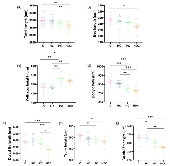 In accordance with a previous report [], we measured a total of 13 morphological indexes immediately after hatching (Figure 2). No significant changes were observed among treatments for six indexes, namely, head depth, eye height, dorsal fin height, total trunk height, anal fin length, and caudal fin length (Figure A1). Significant changes were observed in seven indexes across the treatments, namely, total length, eye length, yolk height, body cavity length, dorsal fin length, trunk height, and caudal fin height (Figure 5a–g). There were no significant variations observed between the HC treatment group and the C treatment groups in terms of each morphological index. The larvae in the HDC treatment group exhibited an apparently decreased body total length, eye length, dorsal fin length, trunk height, caudal fin height, and body cavity length and an increased yolk sac height in comparison with the control. Both the PC and HDC treatment groups exhibited dysplasia in terms of morphological development in comparison to the control and HC treatment groups.