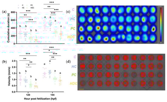 Effects of heterospecific cues (HCs), predator cues (PCs), heterospecific dietary cues (HDCs), and control (C) on swimming performance: (a) cumulative movement duration and (b) velocity of zebrafish larvae at 120 and 144 hpf. Results are expressed as means ± SEM (n = 10). p < 0.05 is indicated by *, p < 0.01 is indicated by **, and p < 0.001 is indicated by ***. Letters denote significant pairwise differences of each chemical treatment between 120 and 144 hpf (p < 0.05). A typical thermal diagram (c) and trajectory diagram (d) of zebrafish larvae at 144 hpf are shown.