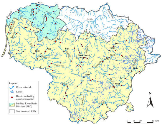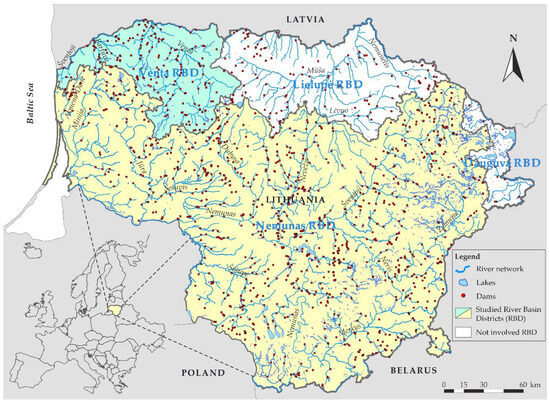 The study was carried out in Lithuania, in the south-eastern part of the Baltic Sea drainage basin. The entire territory (65,300 km2) is in the lowlands. The average surface elevation is 99 m above sea level, with a maximum elevation of 220–290 m above sea level on some hilltops, so the average slope of river beds rarely exceeds 1 m/km, and typically ranges between 0.05 and 2.5 m/km. Only in single stretches of some small streams, the riverbed slope can reach up to 6–7 m/km. The area is drained by 4 large river basins: Nemunas, Venta, Lielupe and Daugava. The largest part, 72%, is covered by the basin of the large European river, Nemunas (catchment size 98,000 km2), which flows into the Baltic Sea within the territory of the country. The other 3 rivers enter the Baltic Sea in the territory of neighbouring Latvia, but only the basin of the Venta is accessible to migratory fish in Lithuania. The other two river basins are fully (Daugava) or partially (Lielupe) blocked to fish migration by barriers in Latvia. Therefore, artificial barriers were prioritised only in the Nemunas and Venta river basins, which together cover 81% of the country’s territory. According to the state water cadastre, 1231 dams and weirs have been installed in these river basins, amounting to 1 barrier/24.4 km or 1 barrier/43.0 km2 (Figure 1).