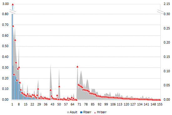 The position of all 155 dams according to the Rbarri and HRbarri scores and the calculated Asuit in the river network sections above each dam. The primary vertical axis denotes the Rbarri and HRbarri values; the secondary axis denotes Asuit in km2.