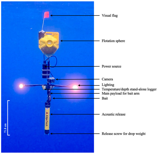 Diagram of the deep-sea BRUV (dBRUV) video camera/lander system used in the present studies, with associated components. Filmed during ascent after the sacrificial weight was released.