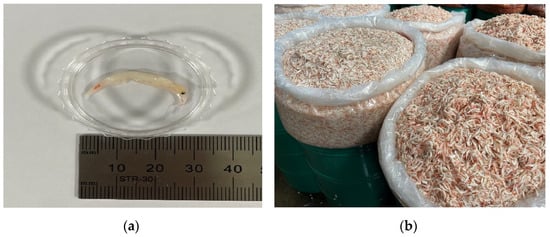 A total of 56 commercially available Saeu-jeot preparations (49 from markets in Korea, 5 from China, and 2 from Vietnam) with a shelf life of more than one year were collected. Of these 56 samples, 16 had domestic HACCP certification. All samples used in this study were prepared by mixing 70–80% tiny shrimp (about 30 mm long; Figure 1a) with 20–30% salt. The samples (Figure 1b) were stored in a refrigerator at 4 °C while maintaining the manufacturer’s packaging, and analysis was performed within 15 days of the date of purchase.