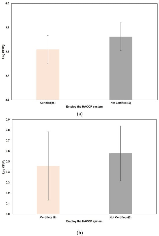 The result of microbial contamination in manufacturer’s employing the HACCP system and not employing the HACCP system. (a) Total viable count; (b) S. aureus count. Certified: manufacturer employed the Hazard Analysis Critical Control Point (HACCP) system; Not Certified: manufacturer did not employ the HACCP system.