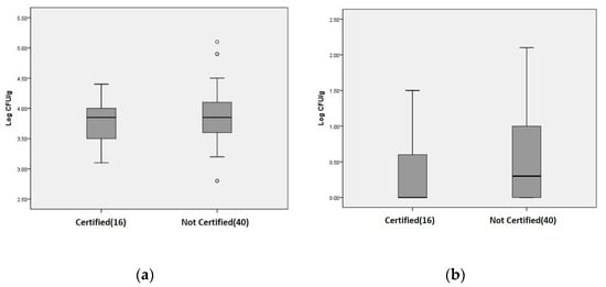 The box plot of the total viable count in salted-fermented shrimp, including microbial contaminants and pathogenic bacteria. (a) Total viable counts; (b) S. aureus counts. Certified: manufacturer employed the Hazard Analysis Critical Control Point (HACCP) system; Not Certified: manufacturer did not employ the HACCP system.