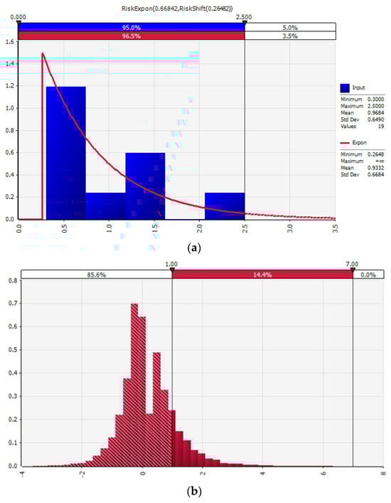 The results of the contamination distribution analysis in the tested commercial Saeu-jeot samples are shown in Figure 4. The probability distribution of S. aureus-positive samples among the analyzed samples revealed an exponential distribution as the optimal distribution. The predicted contamination for a positive sample was 0.9 ± 0.7 log CFU/g (Figure 4a). Based on these results, a simulation model was developed for predicting S. aureus contaminations in Saeu-jeot in their current production and distribution environment. After 10,000 simulations, the predicted contamination level of S. aureus in Saeu-jeot was 0.2 log CFU/g (Figure 4b). These results indicated that the risk of S. aureus in Saeu-jeot was low; however, the confirmed contamination with S. aureus indicated poor hygiene management in the workplace. In addition, S. aureus proliferates if the salt is diluted and, if the product is left unattended for long periods at room temperature, it can also contaminate the product []. Therefore, the steps of the manufacturing process should be investigated to identify the causes of and control S. aureus contamination.