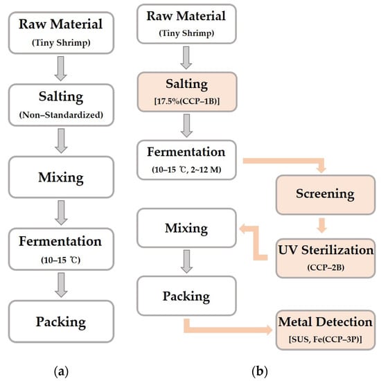 (a) Diagram of the traditional Saeu-jeot manufacturing process. (b) The HACCP system applied to the Saeu-jeot manufacturing process. CCP-1B: Saltiness; CCP-2B: Ultraviolet (UV) wavelength and exposure time; CCP 3P: Stainless steel (SUS) and Iron (Fe).