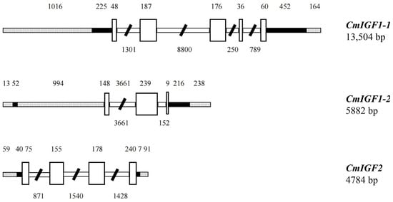 Genomic structure of CmIGFs. The shadow represents the flanking region, the black horizontal frame represents the untranslated region, the white vertical frame represents the exon, the white horizontal frame represents the intron, and the numbers above and below each schematic represent the length, respectively.