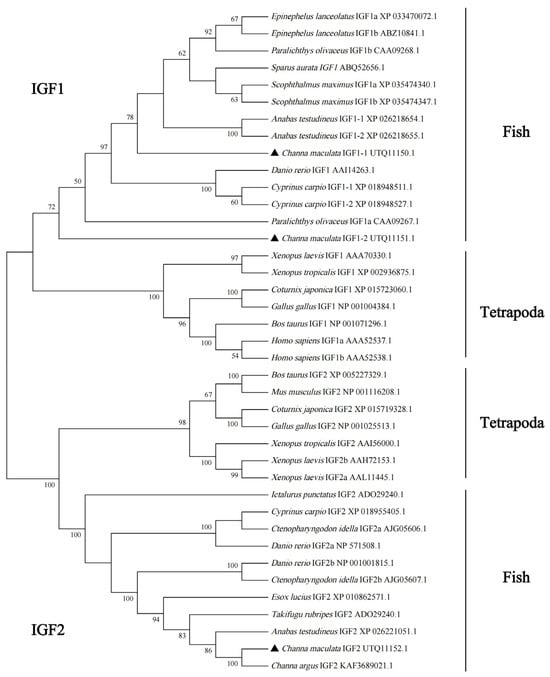 Growth, one of the most crucial economic traits in farmed fishes, plays a vital role in the advancement of aquaculture. In the present study, IGFs, which are known to be involved in growth regulation, were characterized in blotched snakehead (C. maculata). Consistent with findings in zebrafish (D. rerio) [] and giant grouper (E. lanceolatus) [], two copies of IGF1 were identified in blotched snakehead, designated as CmIGF1-1 and CmIGF1-2, located on chromosomes 15 and 10, respectively []. The IGF1 gene in many fish species, including giant grouper (E. lanceolatus) [], ussuri catfish (Pseudobagrus ussuriensis) [], and zebrafish (D. rerio) [], typically consists of five exons and four introns, with intron 2 being the longest. In our study, CmIGF1-1 also consisted of five exons and four introns, with intron 2 being the longest at 8800 bp. In contrast, CmIGF1-2 manifested a more concise structure, with solely three exons and two introns. The structural differences between the two gene products may potentially stem from divergent splicing methodologies []. The IGF2 gene differs from IGF1 in exon–intron composition in ussuri catfish (P. ussuriensis) [] and yellow catfish (P. fulvidraco) [], typically consisting of four exons and three introns. In this study, CmIGF2 comprised four exons and three introns. The alignment of amino acid sequences revealed conserved IGF domains in both IGF1-1 and IGF1-2 across species. Furthermore, IGF2 exhibited conserved IGF and IGF2_C domains, which play a vital role in protein folding, maintaining proper secondary spatial structure, and facilitating normal physiological functions []. Evolutionary analysis revealed that IGF1 and IGF2 clustered together among all fish species, diverging from those of tetrapods, which encompass mammals, birds, and reptiles. Our findings are consistent with both systematic evolutionary analysis and traditional taxonomy.