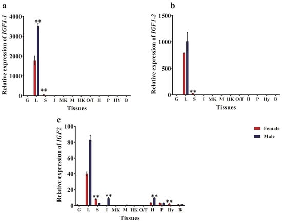 The expression levels of CmIGFs in male and female blotched snakeheads were assessed through qPCR. As depicted in Figure 3, similar expression patterns of CmIGF1-1 (Figure 3a) and CmIGF1-2 (Figure 3b) were observed, primarily expressed in liver (L), with low levels in spleen (S), and undetectable in other tissues. Interestingly, the expression levels of CmIGF1-1 and CmIGF1-2 in the liver (L) exhibited significant sexual dimorphism between males and females (p < 0.01). CmIGF2 transcripts were strongly expressed in the liver (L), with higher expression in males compared to females (p < 0.01). Additionally, moderate expression levels were detected in spleen (S), intestines (I), and heart (H), with significant sex differences (p < 0.01), while low levels were observed in other tissues (Figure 3c).