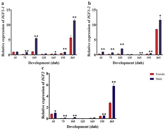 In order to investigate the role of CmIGFs in growth, the expression levels of CmIGFs in liver (L) were analyzed across seven different developmental stages. Males reached body lengths of 9.6 ± 0.8 cm at 45 dah, 14.3 ± 0.8 cm at 75 dah, 21.3 ± 0.8 cm at 105 dah, 27.1 ± 1.2 cm at 135 dah, 29.1 ± 1.9 cm at 165 dah, 31.1 ± 1.3cm at 195 dah, and 44.7 ± 1.6 cm at 365 dah, and females reached body lengths of 9.7 ± 0.4 cm at 45 dah, 14.3 ± 0.7 cm at 75 dah, 20.5 ± 1.1 cm at 105 dah, 24.9 ± 1.5 cm at 135 dah, 28.0 ± 1.5 cm at 165 dah, 27.5 ± 2.8 at 195 dah, and 40.1 ± 1.3 cm at 365 dah. As shown in Figure 4, CmIGFs expression was higher in males than that in females across different developmental stages. In females, CmIGF1-1 maintained low expression levels from 45 to 195 dah and peaked at 365 dah (p < 0.01). For male individuals, the transcription of CmIGF1-1 started increasing from 75 to 105 dah and reached a tiny peak at 105 dah (p < 0.01). Subsequently, the expression levels decreased significantly from 105 dah to 195 dah before reaching the highest level at 365 dah (p < 0.01) (Figure 4a). The expression patterns of CmIGF1-2 were similar to those of CmIGF1-1 at developmental stages, peaking at 365 dah in both male and female individuals. From 45 to 195 dah, CmIGF1-2 expression maintained a low level in females, while exhibiting a parabolic trend and peaking at 105 dah in males (p < 0.01) (Figure 4b). As for CmIGF2, the expression levels showed a considerable decline from the initial sample in both females and males, reaching the lowest levels at 135 dah. Then, they were gradually up-regulated and peaked at 365 dah (p < 0.01) (Figure 4c).