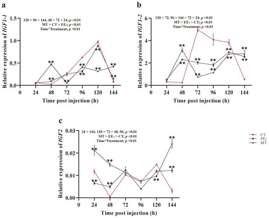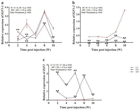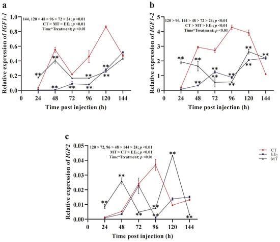 In male individuals, CmIGF1-1 transcripts showed a similar expression pattern, with the parabolic trends in both the control and EE2-treated groups, gradually increasing and reaching their peak at 120 h, then sharply dropping to the initial level at 144 h (F5,10 = 32.762, p < 0.01) (Figure 6a). However, it showed fluctuating variation in the MT-treated group (F2,10 = 54.339, p < 0.01) (Figure 6a). In the control group, CmIGF1-2 expression reached the highest value at 72 h and then gradually decreased and returned to the starting level at 144 h (F5,10 = 54.207, p < 0.01). CmIGF1-2 expression displayed fluctuating changes in the EE2-treated and MT-treated groups (F2,10 = 33.880, p < 0.01), with the expression level at 144 h being significantly higher than that in the control group (Figure 6b). CmIGF2 expression exhibited a similar dynamic pattern of change in both the control and EE2-treated groups, with CmIGF2 being sharply down-regulated in the control group from 120 h, while showing a slight up-regulation (F2,10 = 55.904, p < 0.01) in the EE2-treated group. After MT treatment, CmIGF2 transcription gradually decreased and reached the lowest level at 96 h and then quickly rose to the highest level at 144 h, which was significantly higher (F5,10 =92.615, p < 0.01) than that in the control group (p < 0.01) (Figure 6c).