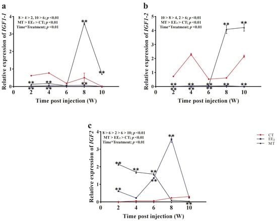 As shown in Figure 8a,b, the expression levels of CmIGF1-1 (F2,8 = 57.041, p < 0.01) and CmIGF1-2 (F2,8 = 62.436, p < 0.01) remained low in males after the administration of EE2, being lower than those in the control group. Upon the administration of MT, the transcription of CmIGF1-1 (F4,8 = 78.874, p < 0.01) and CmIGF1-2 (F4,8 = 43.802, p < 0.01) remained at low levels until 6 weeks, then increased sharply and reached their peaks at 8 and 10 weeks, respectively, which were significantly higher than those in the control group (Figure 8a,b). EE2 and MT treatments up-regulated (F2,8 = 69.567, p < 0.01) the expression levels of CmIGF2 compared to the control group at 2 weeks (Figure 8c). After that, CmIGF2 expression displayed a decreasing trend and achieved the lowest level at 10 weeks (F4,8 = 58.721, p < 0.01) (Figure 8c). In contrast, CmIGF2 transcripts dramatically increased from 4 weeks and reached the peak (F2,8 = 69.567, p < 0.01) at 8 weeks with EE2 administration and subsequently rapidly declined to the lowest level at 10 weeks (F4,8 = 58.721, p < 0.01) (Figure 8c). At 10 weeks post-treatment, males treated with EE2 achieved an average body length of 24.3 ± 1.6 cm and a body weight of 330.6 ± 7.4 g. Compared to the control group, which presented an average body length of 28.6 ± 1.3 cm and a body weight of 370.5 ± 8.8 g, the growth rates were reduced by 15.1% in length and 10.8% in weight. Males treated with MT reached an average body length of 33.7 ± 1.4 cm and a body weight of 406.2 ± 10.3 g, indicating the increased growth rates of 15.1% in length and 15.1% in weight compared to the control group.